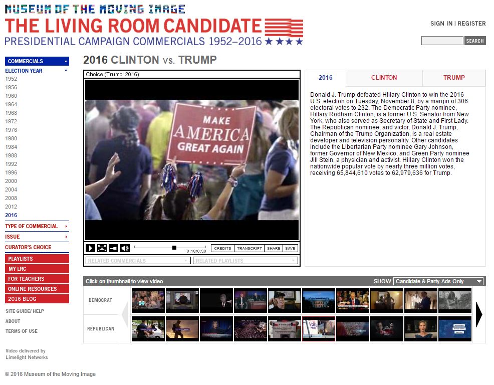 The Living Room Candidate, a web project of the Museum of the Moving Image, hosts a collection of campaign commercials from each presidential campaign going back to 1952 (Eisenhower defeated Stevenson). Updated for 2016 to cover the Clinton-Trump campaign, each commercial is played on the screen with a commentary about the salient points of the ad. If you have never seen any of the "I Like Ike" ads for Eisenhower, treat yourself to sixty-seconds of down-home 1950's kitch.