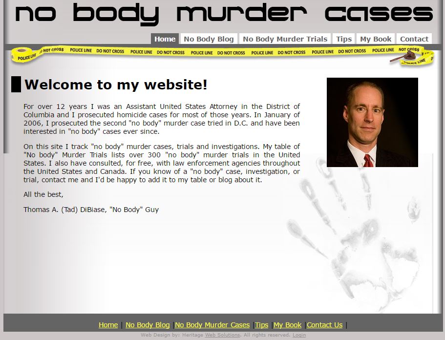 If there can be a weirder collection site than one assembled by a former federal homicide prosecutor, the Doctor is hard pressed to think of it. The website created by Tad DiBiase discusses the intricacies of investigating and prosecuting murder cases where the body of the victim has not been found. I'm sure one of the questions he answers is the Doctor's first: How do you know a murder has been committed if there is no body to be found?