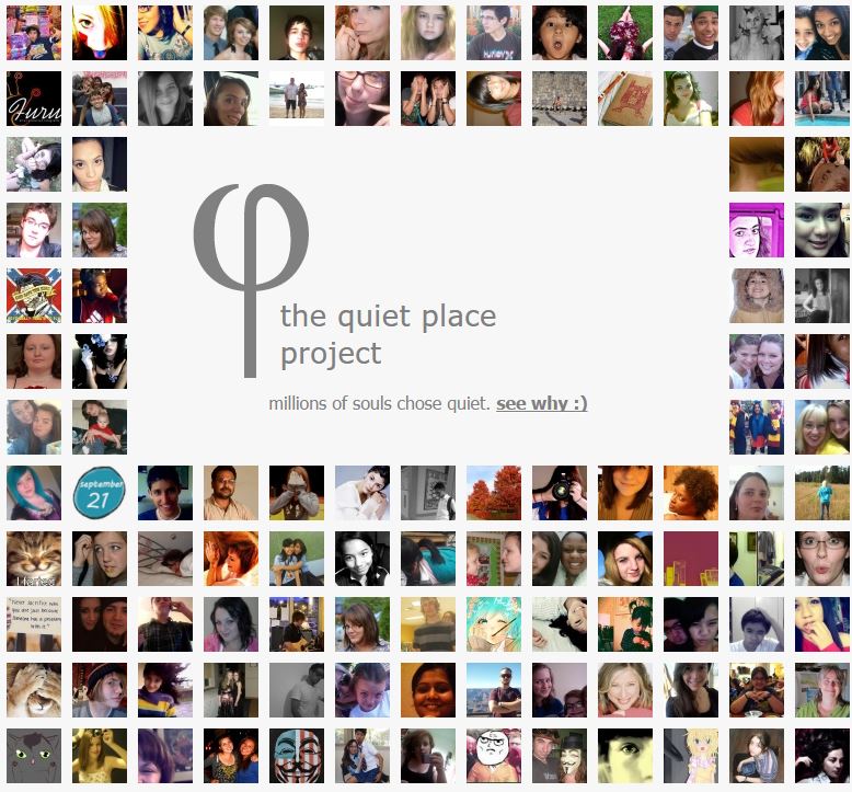Everyone needs a quiet place now and then. Some more than others. Others more often than some. Either way, The Quiet Place Project may offer what you're looking for. The front page has selfies of visitors and hovering over an image makes a quote about his/her experience pop up.